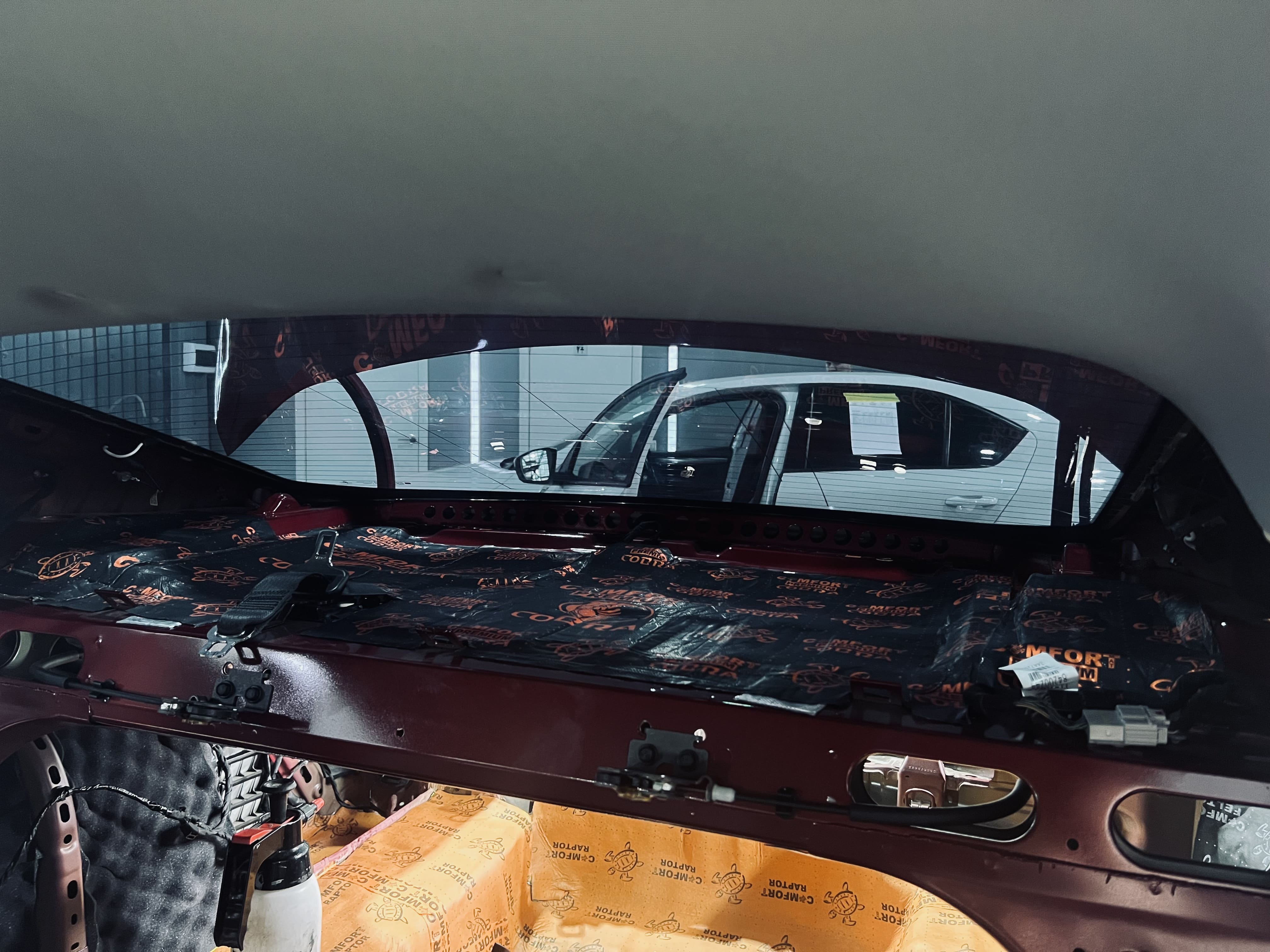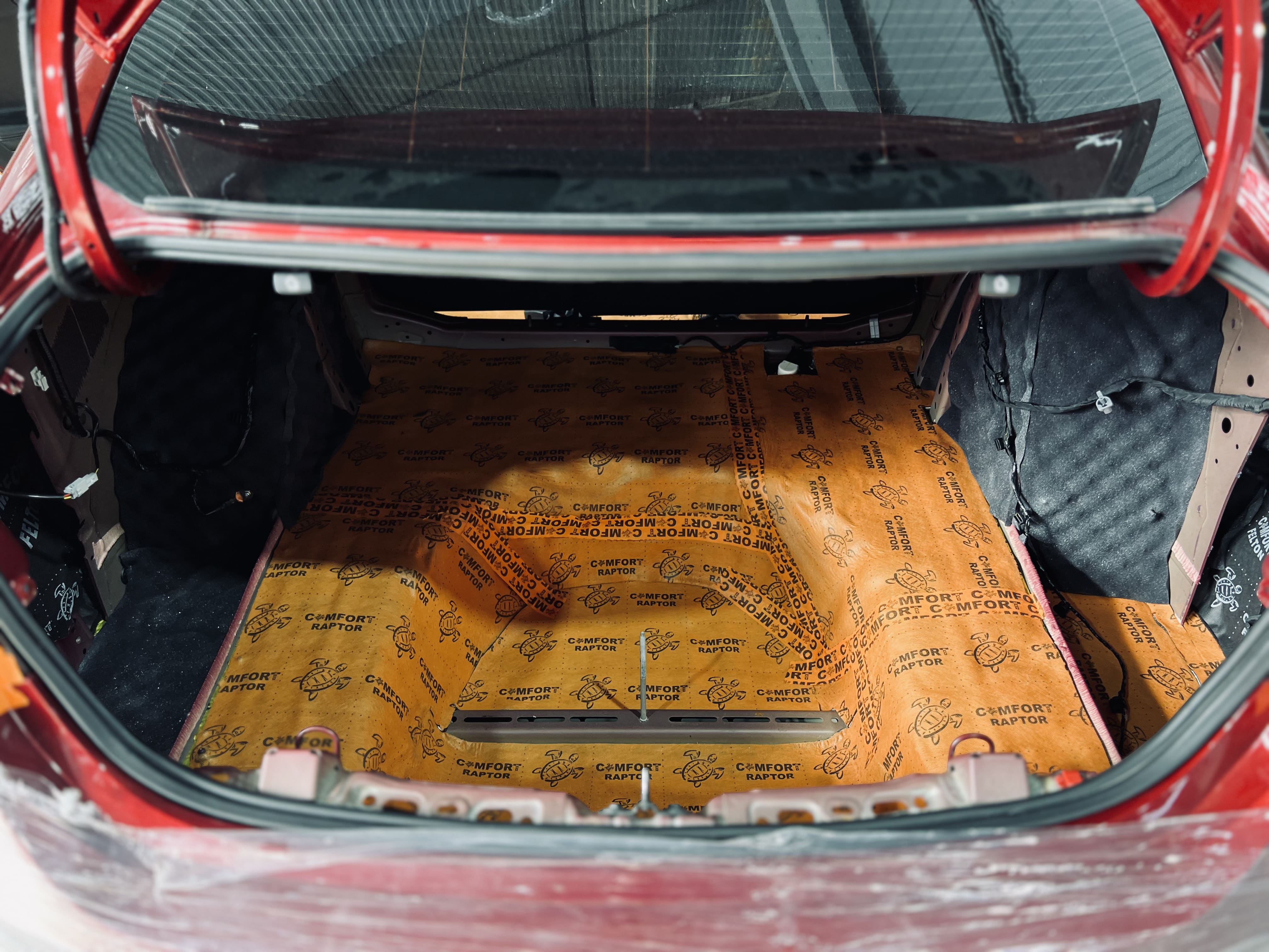 Первым слоем на днище и дно багажника нанесли виброизоляцию Comfort Mat Spider, а на стенки багажника – Comfort Mat Vespa.