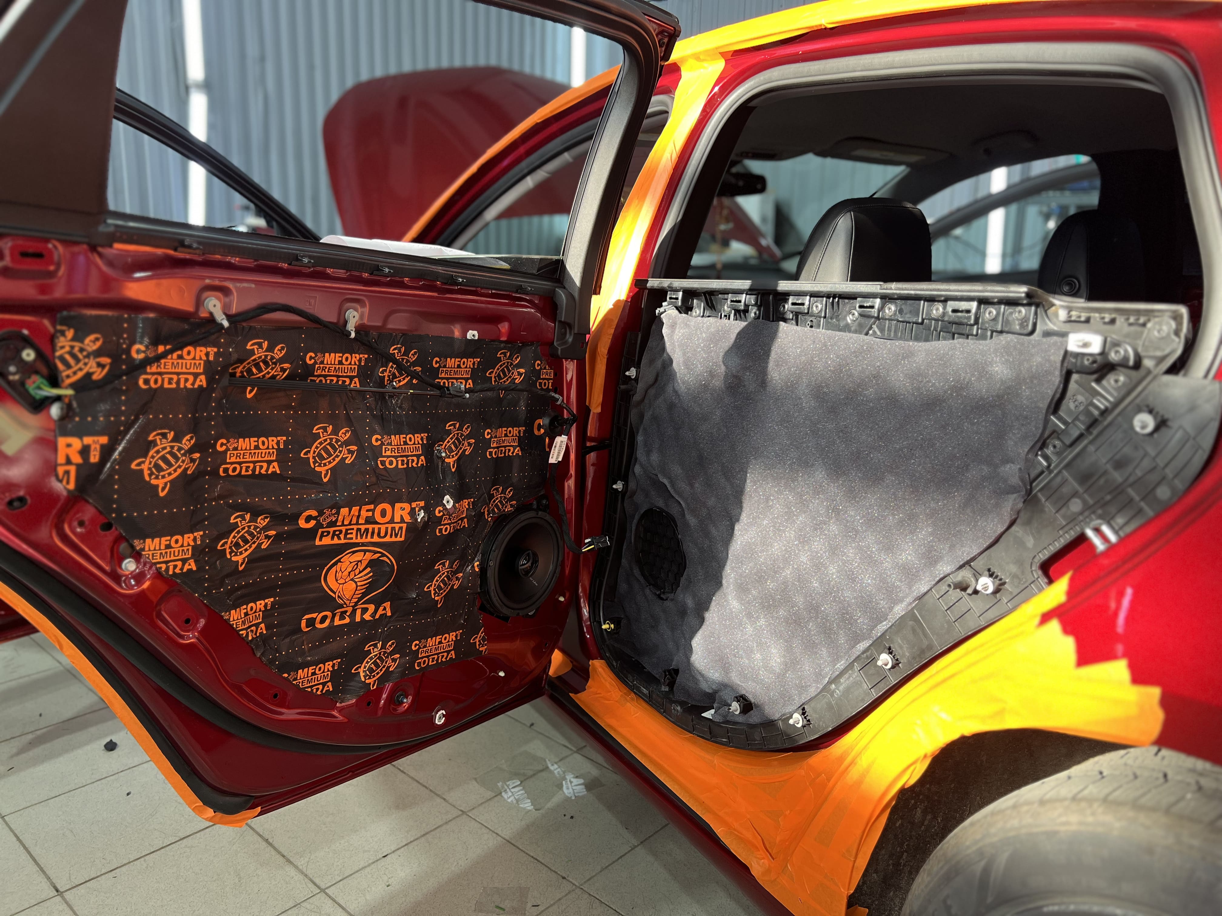 Первым слоем на двери и дверь багажника нанесли виброизоляцию Comfort Mat Dark Cobra.