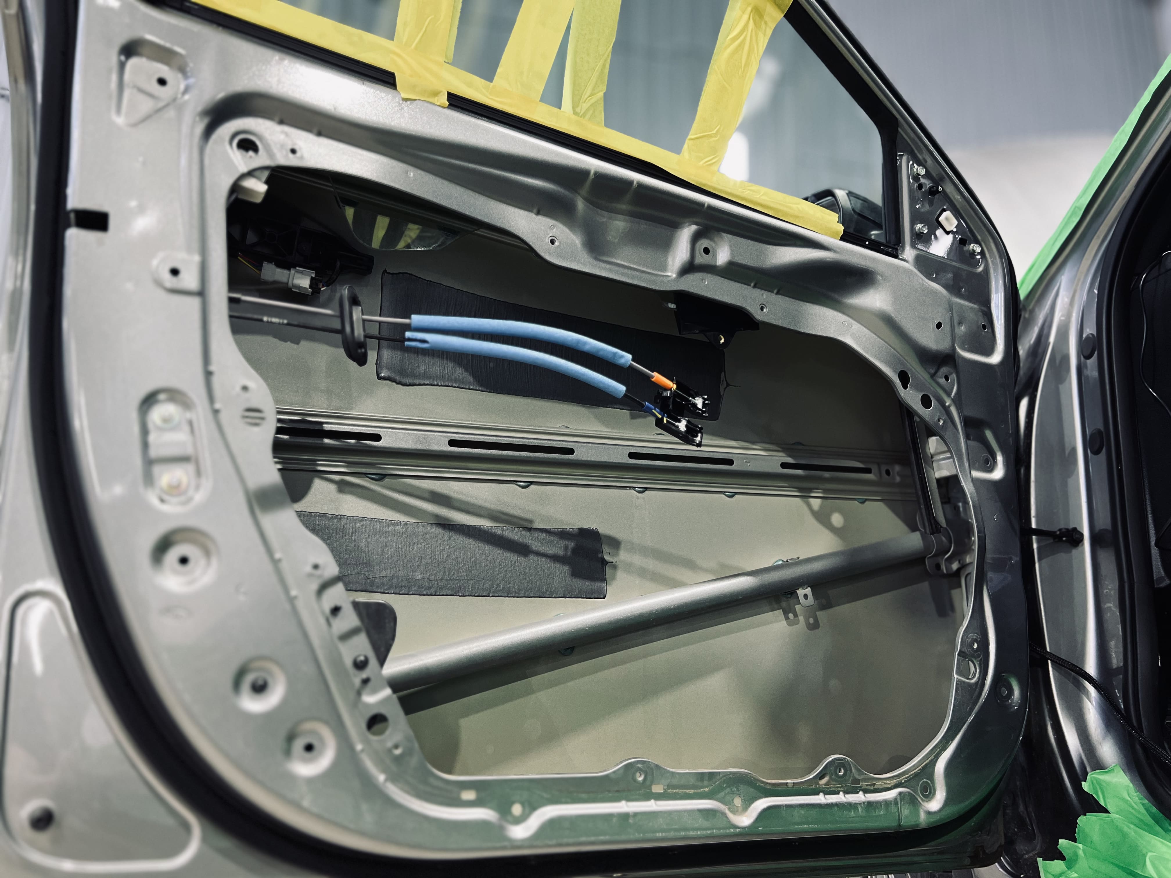 Работа началась с демонтажа дверных карт и подготовки двери к нанесению материалов.