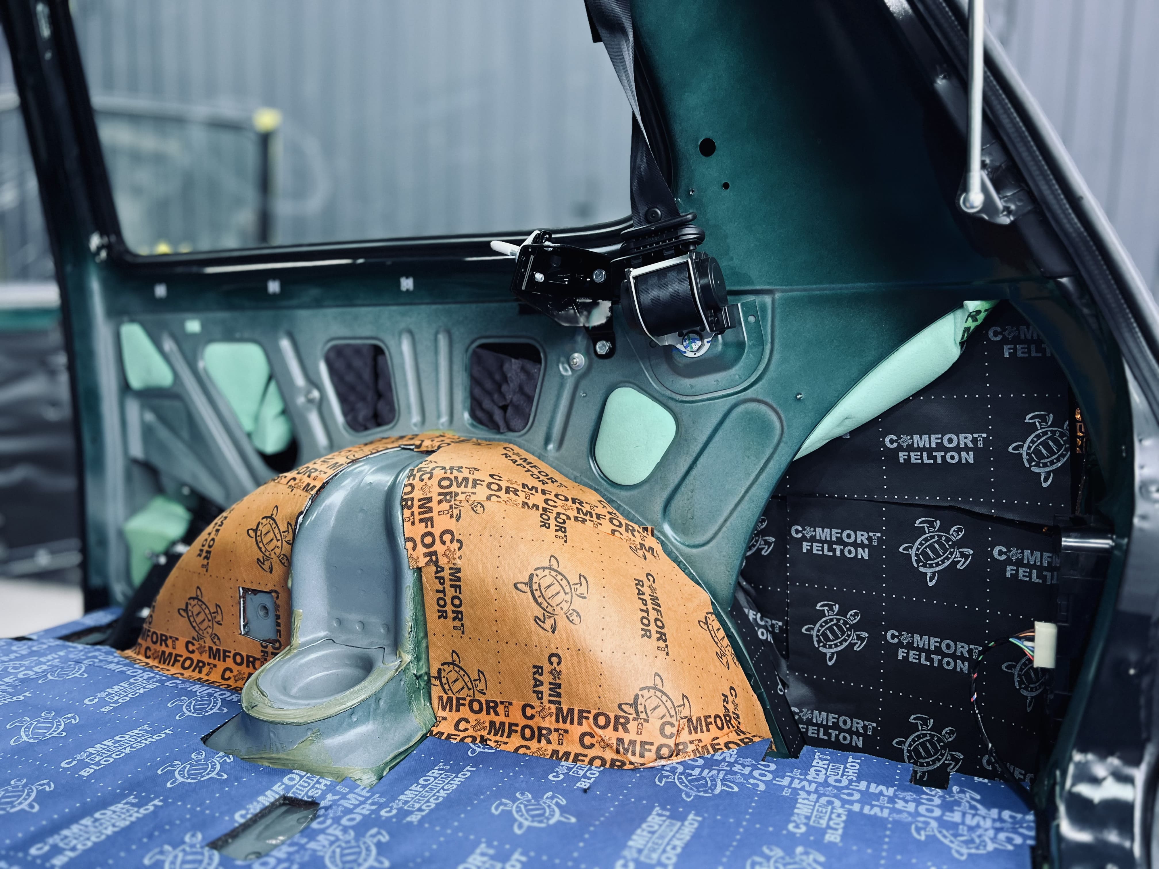 Вторым слоем на дно салона и багажник уложили Comfort Mat Blockshot, а на выступающие части над колесными арками и в районе центральной консоли – Comfort Mat Raptor. На стенки багажника нанесли Comfort Mat Felton и Comfort Mat Soundtrap Green. На снимке видны готовые слои Blockshot, Raptor, Felton и Soundtrap Green, обеспечивающие максимальное поглощение шума. Для закрытия швов и стыков мы использовали контурную ленту, подобранную в тон шумоизоляции, что не только повышает надежность, но и придает эстетичный вид, даже скрытый под ковровым покрытием.