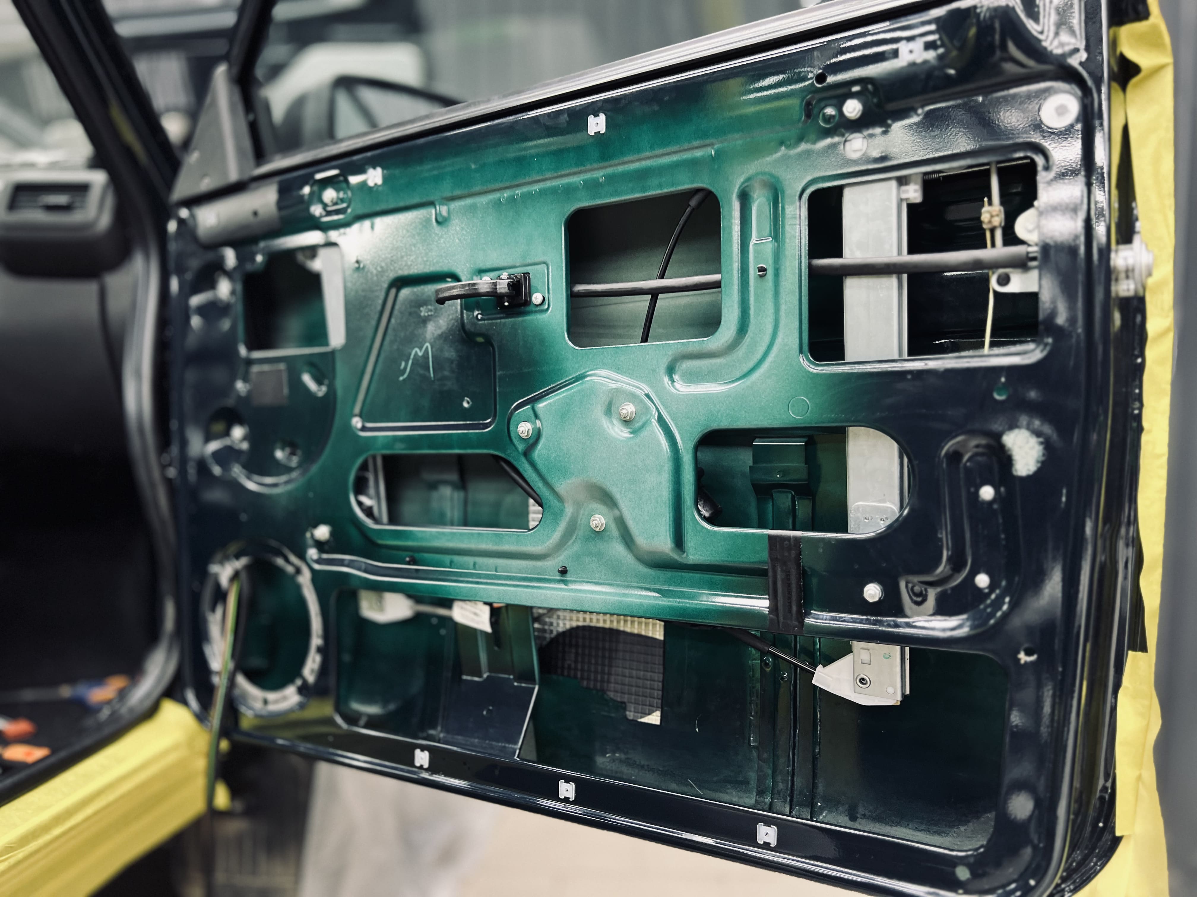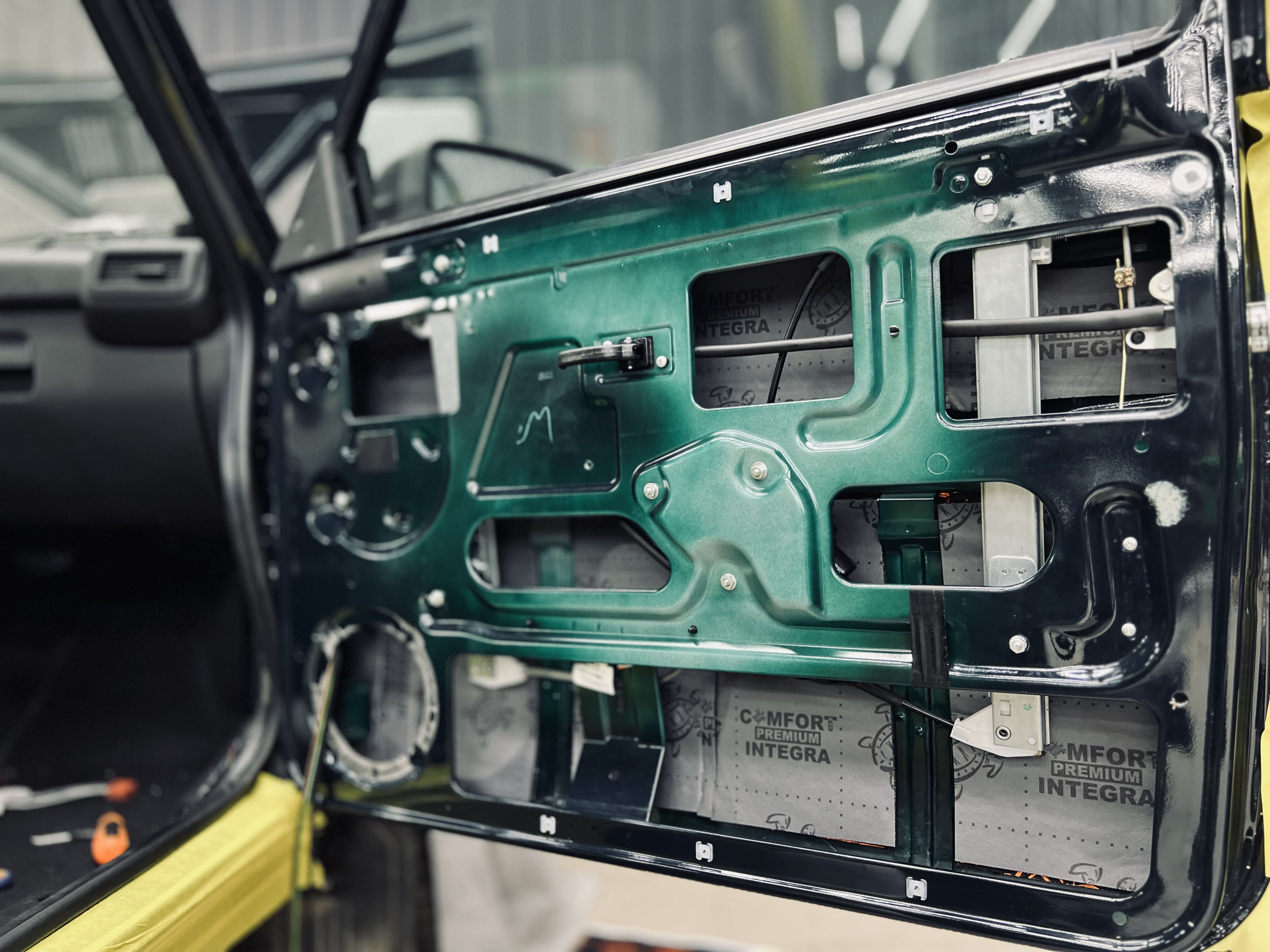 Работа началась с демонтажа дверных карт, показана дверь с чистым металлом, готовая к нанесению материалов.
