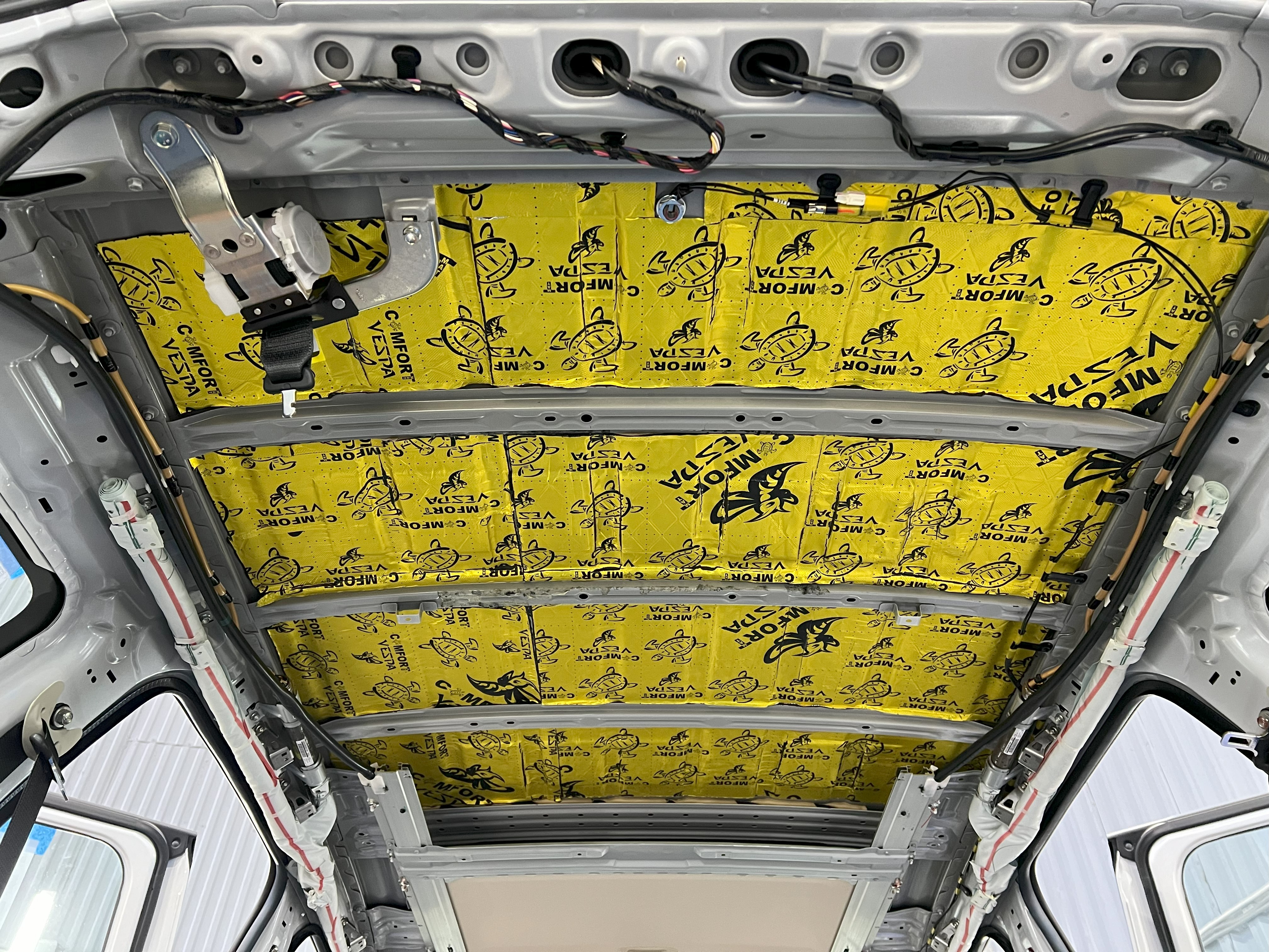 Первым слоем нанесли Шумоизоляция Comfort Mat Vespa, которая гасит вибрации и поглощает шумы. На фото видна крыша, покрытая слоем Vespa, с равномерным и плотным нанесением.