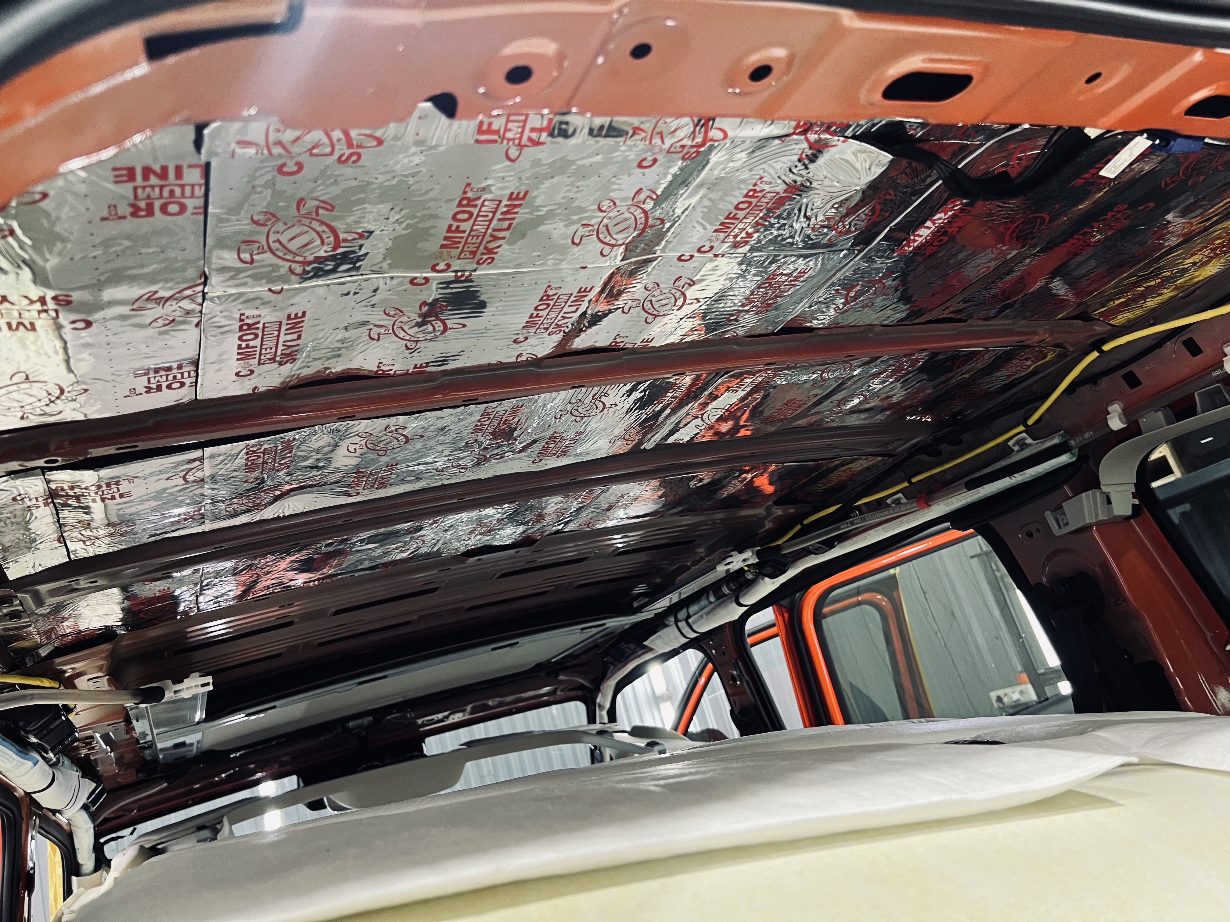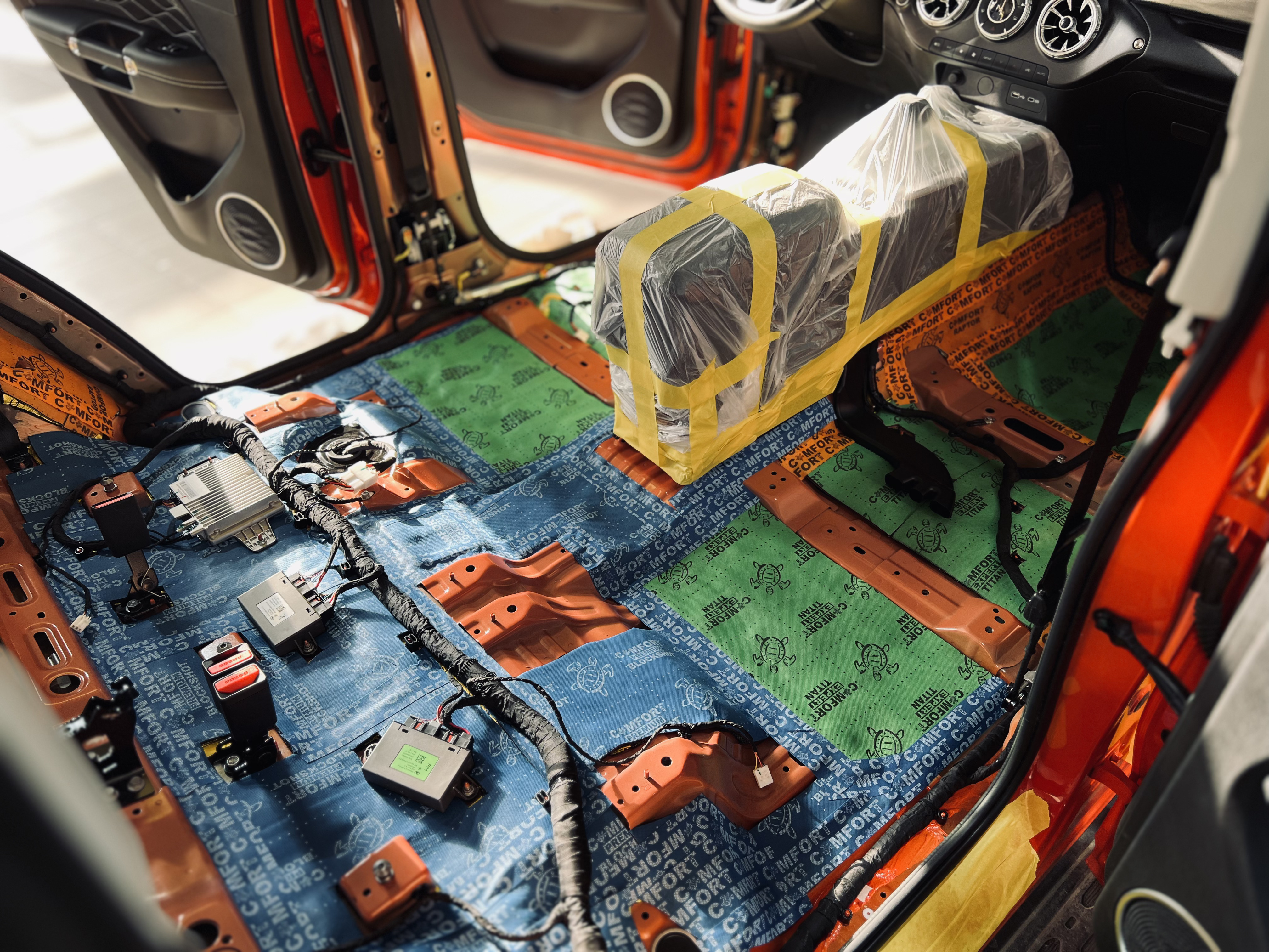 Вторым слоем уложили шумоизоляцию Comfort Mat Premium Skyline, легкий и эффективный материал, завершающий изоляцию.
