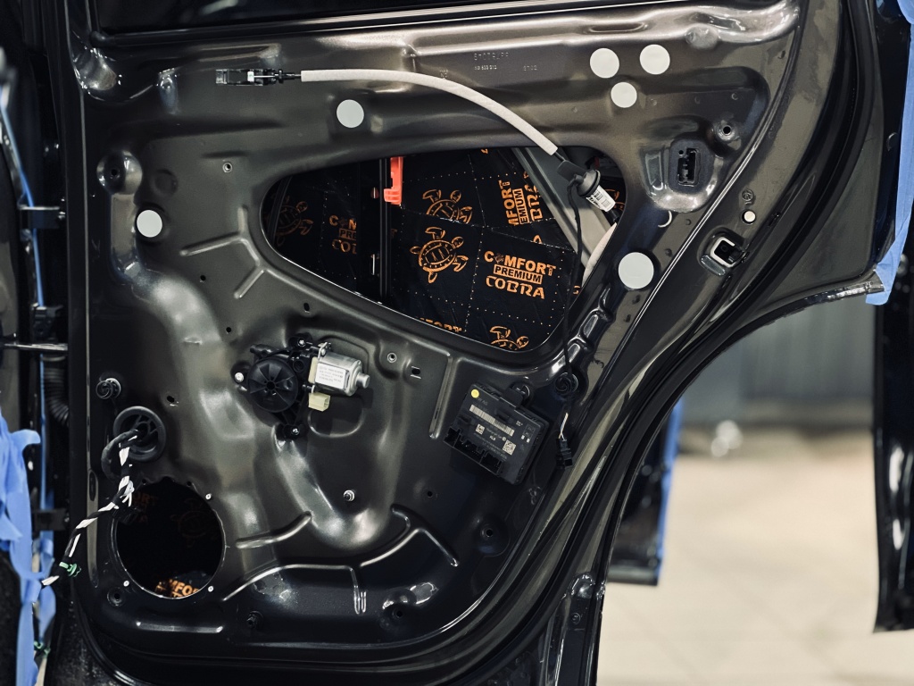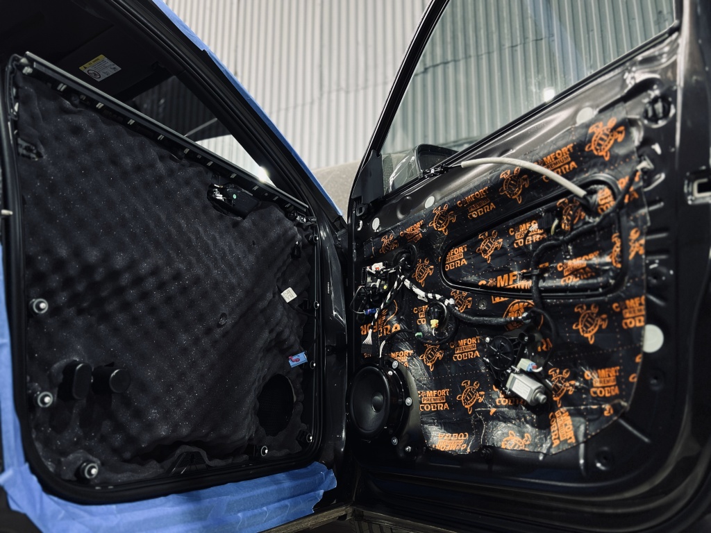 Первым слоем нанесли Виброизоляцию Comfort Mat Dark Cobra, которая гасит вибрации и создает прочную основу.