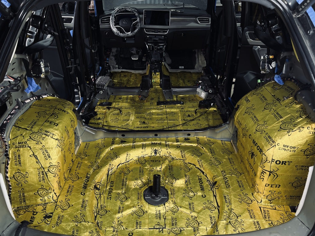 Первым слоем на днище и багажник наклеили Виброизоляцию Comfort Mat Spider, которая эффективно гасит вибрации кузова. На изображении виден процесс укладки Spider в районе переднего пассажирского сиденья, где материал аккуратно прикатан к металлу.
