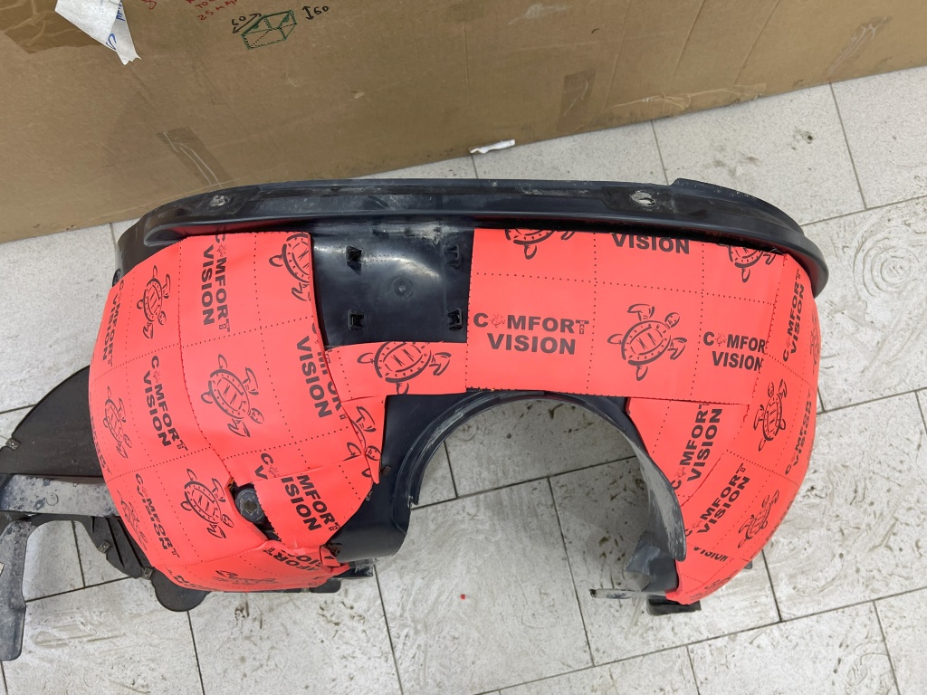 Для подкрылок использовали комбинацию материалов: Comfort Mat Expert Locker, Comfort Mat Dark Cobra и Comfort Mat Vision. На фото виден один из снятых подкрылков с наклеенным слоем Comfort Mat Vision, обеспечивающим плотную изоляцию.